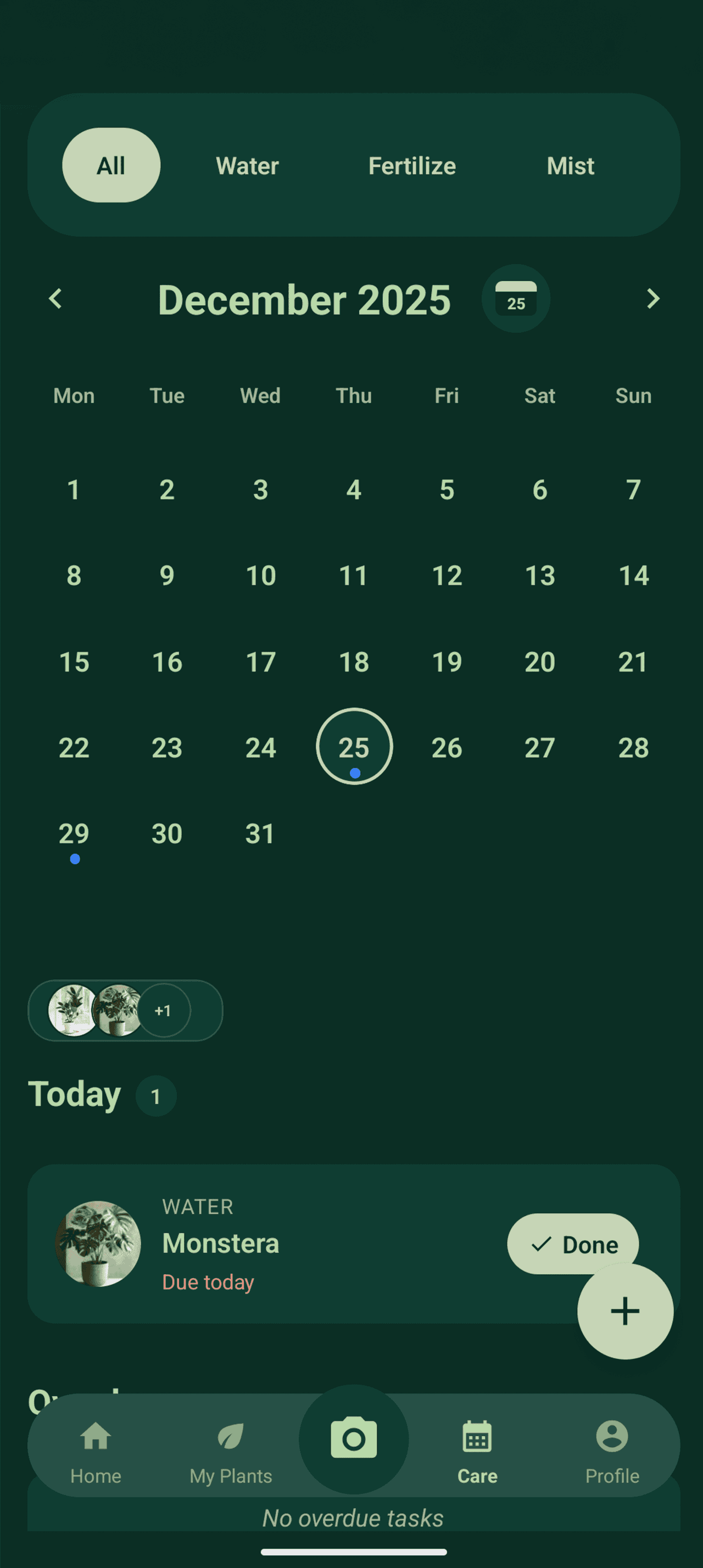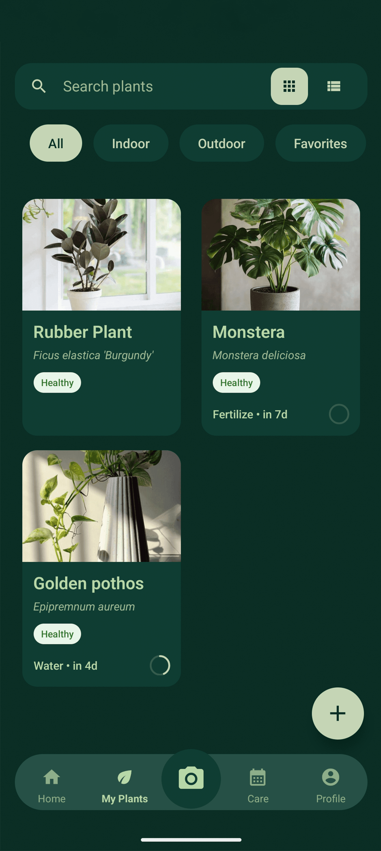 Watering, light, fertilizing, repotting—tailored to your plant and home.